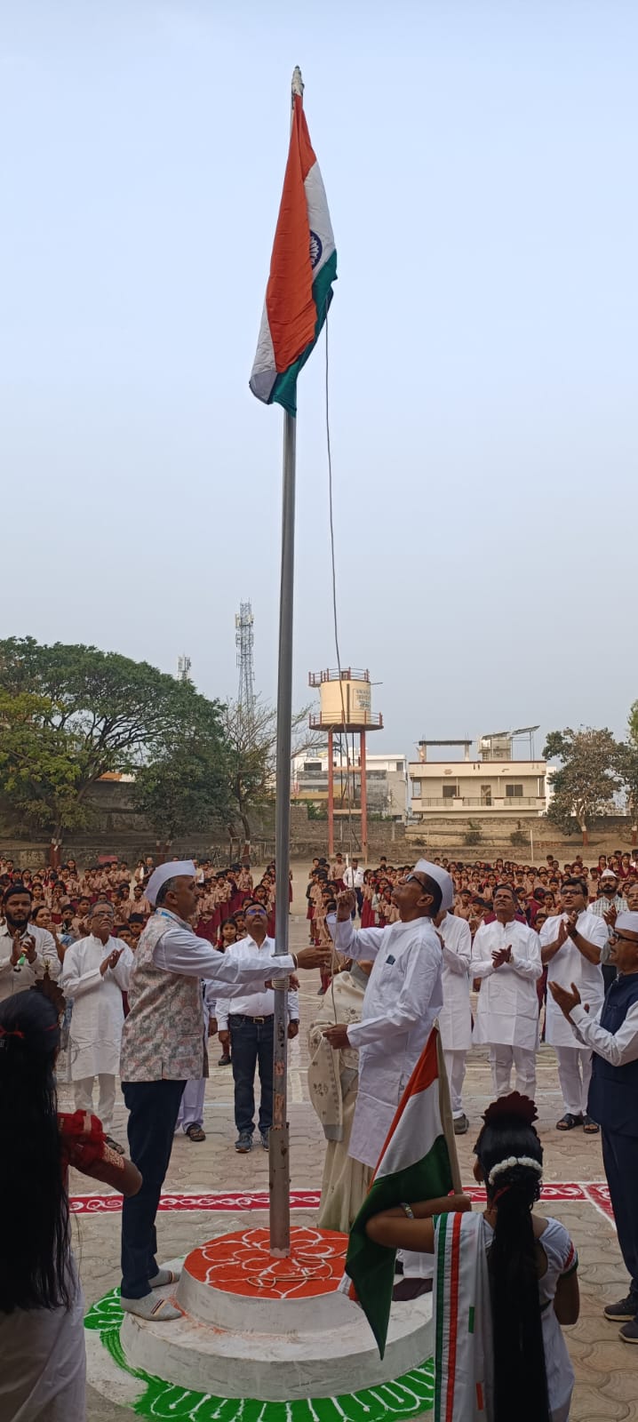 छत्रपती सभाजीनगर गुरुदेव समंतभद्र विद्यामंदिर मध्ये भारतीय प्रजासत्ताक दिनाचा 77 वा वर्धापन दिन मोठ्या उत्साहात व विविध कार्यक्रमाच्या रेलचेल मध्ये साजरा करण्यात आला यावेळी सकाळी वेरूळ गावातून प्रशालेतील 1200 विद्यार्थ्यांची भव्य प्रभात फेरी काढण्यात आली. “भारतीय प्रजासत्ताक दिन चिरायू हो” जय जवान जय किसान” या नाऱ्यांनी वेरूळ गावातील गावकऱ्यांचे लक्ष प्रभात फेरीकडे आकर्षित झाले होते . प्रशालेच्या भव्य प्रांगणात ध्वजारोहणाचा कार्यक्रम संपन्न करण्यात आला यावेळी आयोजित कार्यक्रमात अध्यक्षस्थानी संस्थेचे विश्वस्त दिनेश गंगवाल महामंत्री डॉ. प्रेमचंद पाटणी शालेय समिती अध्यक्ष मदनलाल पांडे कोषाध्यक्ष सुमित ठोले, ध्वजारोहक गौतमजी ठोले माजी मुख्याध्यापक निर्मल ठोले शिक्षक संजय महाजन अरुण तपशी राजेंद्र अंबरकर बाल ब्रह्मचारी पंडित मनीष भैया यांची प्रमुख उपस्थिती होती विद्यार्थ्यांच्या दैनंदिन परिपाठ अंतरंग शासन स्तरावरून आयोजित परिपत्रकाप्रमाणे विद्यार्थ्यांच्या कवायत कार्यक्रमाचे आयोजन यावेळी करण्यात आले . या कार्यक्रमासाठी तहसीलदार संतोष गुट्टे गटविकास अधिकारी प्रकाश नाईक गटविस्तार अधिकारी सचिन वाघ व शिक्षण विस्तार अधिकारी किशोर केवट उपस्थित होते.यासाठी प्रशालेचे क्रीडा शिक्षक आशिष कान्हेड दिपाली बाहेती यांचे प्रमुख मार्गदर्शन विद्यार्थ्यांना लाभले होते. कार्यक्रमाचे प्रास्ताविक यावेळी गुलाबचंद बोराळकर यांनी केले तर प्रजासत्ताक दिनावर प्रज्वल आवटी या विद्यार्थिनीने आपले मनोगत व्यक्त केले विद्यार्थ्यांतील कलागुणांना वाव देण्याच्या दृष्टीने लेझीम पथकाच्या माध्यमातून त्रिकोण चौकोन स्वस्तिक आयात व प्रशालेचे नाव काढून विद्यार्थ्यांनी उपस्थित मान्यवरांना अचंबीत केले या लेझीम साठी विद्यार्थ्यांना सचिन अन्नदाते वीरेंद्र वाकळे अंकुश ठोले स्वप्निल गोसावी आनंद गंगवाल यांचे मार्गदर्शन लाभले. गुरुकुल मधील विद्यार्थ्यांनी मानवी मनोऱ्याचे प्रयोग सादर केले. यासाठी हर्षवर्धन महाजन व मार्मिक गोरे यांनी विद्यार्थ्यांना मार्गदर्शन केले भारतीय संविधानाचे महत्त्व सर्वांना लक्षात आणून देण्याच्या दृष्टीने सुहास मिश्रीकोटकर यांच्या मार्गदर्शनामध्ये विद्यार्थ्यांनी संविधान पथनाट्य सादर केले तर विविध सांस्कृतिक कार्यक्रमांतर्गत महाराष्ट्राची प्रसिद्ध लावणी गवळण बंजारा गीत भांगडा इत्यादी सिने गीतावर विद्यार्थ्यांनी नृत्याचा कार्यक्रम सादर केला कार्यक्रमाचे सूत्रसंचालन डॉक्टर सुकुमार नवले महेंद्र वाकळे यांनी केले. सांस्कृतिक कार्यक्रमात विद्यार्थ्यांना राजकुमार नरखडे संतोष जैन अशोक सोनवणे पारस जैन दीप
