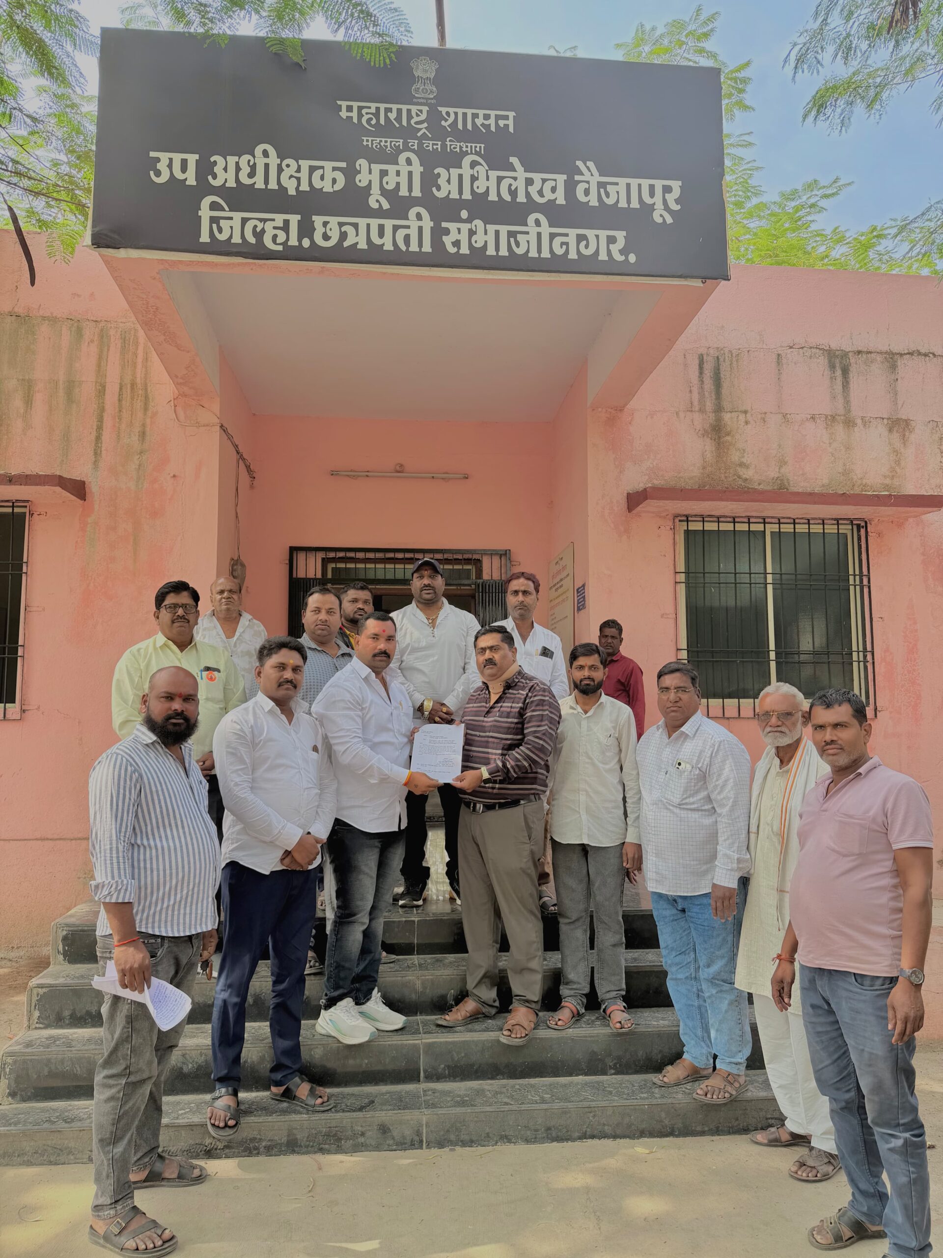 वैजापूर:- वैजापूर उपाधीक्षक भूमि अभिलेख कार्यालयात कर्मचारी यांचा मनमानी कारभार व इतर व्यक्तींच्या गहाळ केलेला फाईल व पैसे घेतल्याशिवाय काम करत नाही व बेकायदेशीर त्यांनी नेमलेला बाहेरील व्यक्ती कार्यालयात येऊन कपाट खोलणे अशा कर्मचाऱ्यांची भूमी अभिलेख कार्यालय वैजापूर येथून हद्दपार करण्यात यावी या मागणी साठी निवेदन देण्यात आले या निवेदनावर ए बी एस सोशल ग्रुप संघटनेचे अध्यक्ष विजय(बाबा)त्रिभुवन, जिल्हा उपाध्यक्ष जिल्हा युवा मोर्चा चे महेश भालेराव, राष्ट्रवादी शहर अध्यक्ष जुबेर चाऊस, धर्मेंद्र त्रिभुवन, संजू राजपूत, आकाश शिंदे, सतीश त्रिभुवन, दत्तू घाटुळ, प्रेम लव्हाडे, विजू शेळके, विश्वनाथ त्रिभुवन, अशोक त्रिभुवन, सुरज त्रिभुवन, शुभम पेटारे आदी ने निवेदन दिले आहे