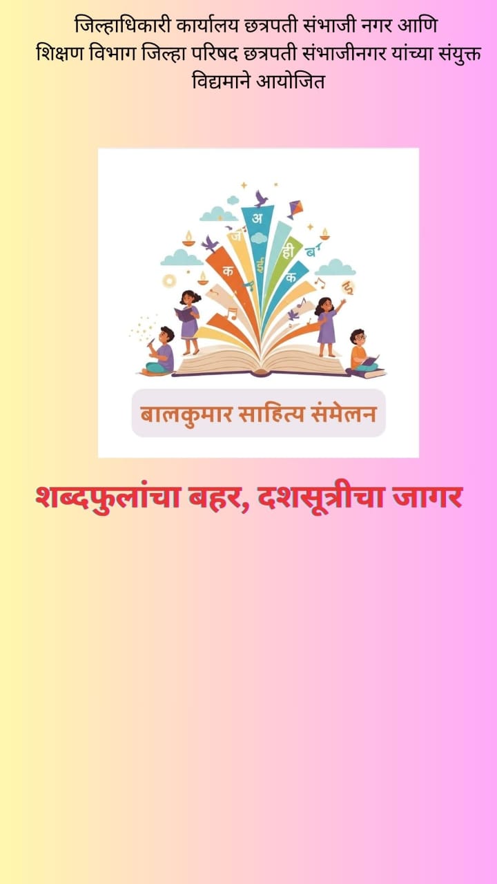 छत्रपती संभाजीनगर, दि.३१(जिमाका)- मराठी भाषा संवर्धन पंधरवाड्यानिमित्त छत्रपती संभाजीनगर जिल्ह्यात पहिले बालकुमार साहित्य संमेलन २०२६ आयोजित करण्यात येत आहे. जिल्हाधिकारी कार्यालय व जिल्हा परिषद शिक्षण विभाग (माध्यमिक) यांच्या संयुक्त विद्यमाने हे संमेलन सोमवार, दि. ०२ फेब्रुवारी रोजी सकाळी ८ ते सायंकाळी ६ या वेळेत द जैन इंटरनॅशनल स्कूल,संग्रामनगर उड्डाणपूल जवळ संभाजीनगर–उदगाव रस्त्याजवळ, शाहनूरवाडी, बीड बायपास येथे संपन्न होणार आहे.