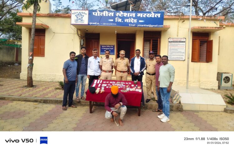 दिनांक ३१ जानेवारी शनिवार रोजी तीन चोरट्यांनी आच्यारे ज्वेलर्सचे शटर तोडून दुकानात प्रवेश केला. दुकानातील सीसीटीव्हि कॅमेरे वर काळा स्प्रे मारण्यात आले. त्यांनी दुकानातील तिजोरी फोडून सोने, चांदी व रोख रक्कम पिशवीत भरून पळ काढण्याचा प्रयत्न करत असताना रात्रगस्त घालत असलेले मरखेल पोलीस ठाण्याचे पोलीस उपनिरीक्षक विलास पवार यांना आच्यारे ज्वेलर्स दुकानाचे शटर अर्धवट उघडे असल्याचे व दुकानासमोर एक व्यक्ती रेकी करत असल्याचे दिसले. त्यावेळी सहायक पोलीस निरीक्षक विलास पवार व त्यांचे सहकारी दुकानाकडे जात असताना पोलिसांची चाहूल लागताच चोरट्यांनी पळ काढण्याचा प्रयत्न केला. यावेळी पोलिसांनी पाठलाग करून सेवकसिंग रघुविरसिंग तिलपले, वय २२ वर्ष, राहणार हनुमानगल्ली, ता.उमरी यास ताब्यात घेतले, तर सद्दाम वय २७ व सोहेल वय २५ वर्ष राहणार ता.उमरी हे दोन पसार झाले.