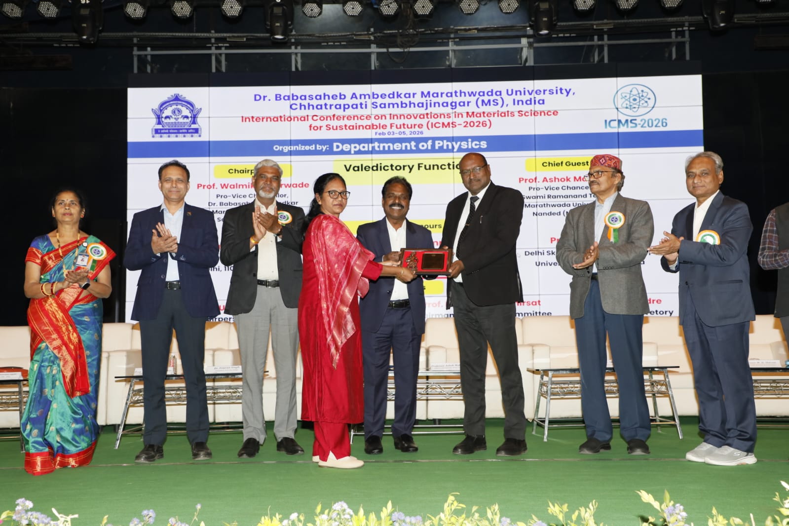 डॉ.बाबासाहेब आंबेडकर मराठवाडा विद्यापीठातील पदार्थविज्ञान विभागाच्या वतीने ‘इनोव्हेशन इन मटेरियल्स सायन्स फॉर सस्टेनेबल फ्युचर’ या विषयावरील परिषदेचा समारोप गुरुवारी सायंकाळी झाला . मा.कुलगुरु डॉ.विजय फुलारी अध्यक्षतेखाली नाट्यगृहात उद्घाटन कार्यक्रम झाला. तर प्रकुलगुरु डॉ.वाल्मिक सरवदे अध्यक्षतेखाली समारोप झाला. यावेळी स्वामी रामानंद तीर्थ मराठवाडा विद्यापीठाचे प्रकुलगुरु डॉ.अशोक महाजन (नांदेड), डॉ.फोरन सिंग व प्रा.एन.एल.सिंग (नवी दिल्ली), कुलसचिव डॉ.प्रशांत अमृतकर, परिषदेच्या अध्यक्षा डॉ.प्रवीणा उगीले, डॉ.एम.डी.शिरसाठ, कन्व्हेनर डॉ.बी.एन.डोळे व सचिव डॉ.प्रभाकर उंदरे यांची मंचावर उपस्थिती होती. यावेळी डॉ.अशोक महाजन म्हणाले, युनायटेड नेशन्स संघटनेने सण २०३० पर्यंत ’सस्टेनेबल डेव्लपमेंट गोल्स’ साध्य करण्याचे उद्दिष्टय समोर ठेवले आहे. गेल्या काही वर्षात जगातील १९० देश याचा परीपूर्तीसाठी प्रयत्न करीत आहेत. या पार्श्वभुमीवर पदार्थविज्ञान विभागाने अत्यंत महत्वपूर्ण विषयावर परिषदेचे आयोजन केले. या क्षेत्रात कृत्रिम बुध्दीमान यासह अनेक बदल होत आहेत. डॉ.महेंद्र शिरसाठ यांनी संशोधक म्हणून उत्तम कार्य केले याच्या आदर्श तरुण संशोधकांनी घ्यावात, असे वाहनही डॉ.महाजन यांनी केले. तर विद्यापीठाच्या इतिहासात एक महत्वपूर्ण परिषद हि ठरेल, असे डॉ. वाल्मिक सरवदे अध्यक्षीय समारोपात म्हणाले. डॉ.शिरसाठ यांनी ’मटेरियल सायन्स’ या क्षेत्रात दिलेले योगदान अत्यंत महत्वाचे असून युवा संशोधकांनी त्यांचा आदर्श घ्यावा, असे आवाहन कुलसचिव डॉ. अमृतकर यांनी केले. तर गेल्या तीन दशकांत अध्यापन व संशोधन क्षेत्रात काम करता आले, विशेषतः गुरुजनांचे मार्गदर्शन, विद्यापीठाचे पाठबळ व संशोधक विद्यार्थ्यांचे सहकार्य ही माझ्या यशाची त्रिसुत्री राहिल्याचे डॉ.शिरसाठ म्हणाले.