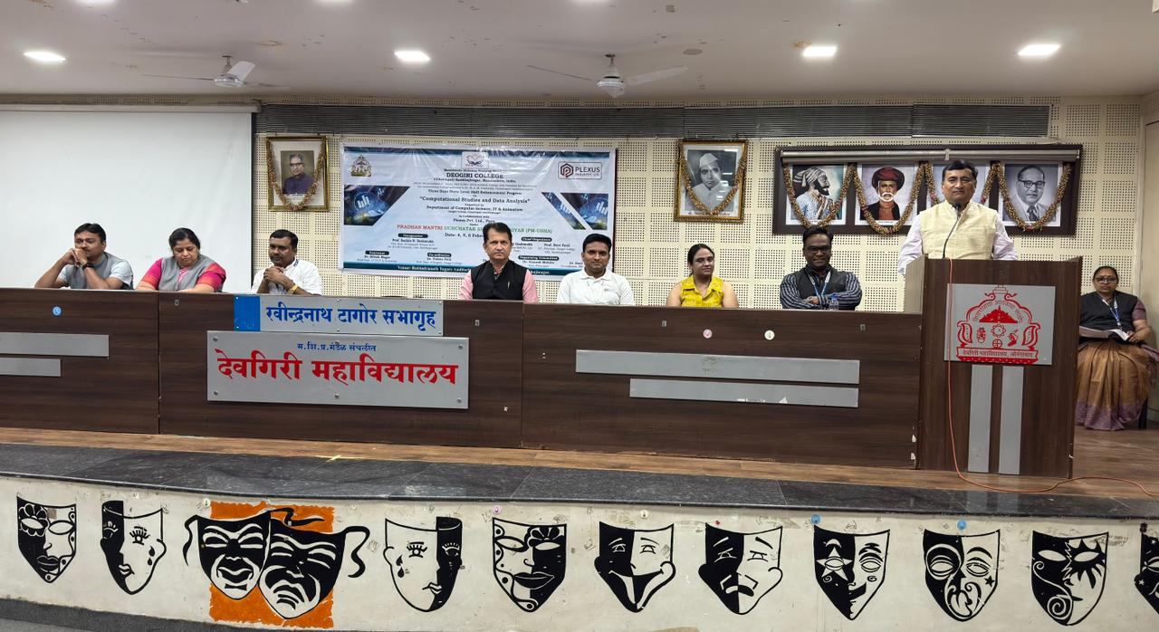देवगिरी महाविद्यालयात आयोजित ‘Computational Studies and Data Analysis’ कार्यक्रमाच्या उद्घाटनप्रसंगी भाषण करताना प्रो. सचिन देशमुख; व्यासपीठावर प्राचार्य डॉ. रवी पाटील व उपप्राचार्य डॉ. गणेश मोहिते, डॉ. अपर्णा तावरे तसेच इतर मान्यवर उपस्थित