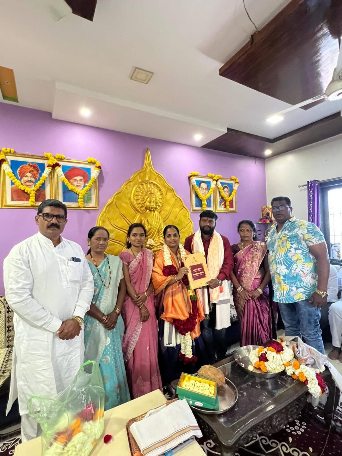 जालना :- प्रथमच जालना महानगरपालीकेच्या पहिल्या महापौर होण्याचा बहुमान मिळालेल्या आमच्या धम्मभगिनी श्रीमती वंदनाताई अरुणराव मगरे यांना मिळाल्याचे औचित्य साधून आज तांदुळवाडी खुर्द येथे चित्तेकर परीवार व गावकरी यांच्या वतिने महापौर वंदनाताई मगरे यांचा माझ्या निवासस्थानी सत्कार करण्यात आला, यावेळी त्यांच्या सोबत आलेले प्रशांत खरात, रणजित मगरे,निलेश मगरे यांचा देखील सत्कार करण्यात आला, यावेळी राष्ट्रवादी काॕंंग्रेस पार्टीचे जिल्हाउपाध्यक्ष तथा मा जिल्हा नियोजन व विकास समिती सदस्य आण्णासाहेब चित्तेकर , माजी सरपंच तथा घाणेवाडी निधोना तांदुळवाडी खुर्द वि वि कार्यकारी सोसायटी च्या व्हा चेअरमन सौ माया आण्णासाहेब चित्तेकर , मा उपसरपंच मधुकरराव निकाळजे, माजी सरपंच परमेश्वरजी कापसे, माजी उपसरपंच साळुबा निकाळजे, अंबादास चित्तेकर ,कडूबा निकाळजे, भानुदासराव लहाने,करण निकाळजे,मुकूल निकाळजे, पोलीस पाटील भिवाजी तायडे, दादाराव लहाने ,शंकरराव चित्तेकर , विलासराव साबळे, तारा चित्तेकर, प्रविण चित्तेकर , पोलीसपाटील प्रांजली चित्तेकर ,प्रशांत चित्तेकर ,सचिन बेडे,बुद्धिवान साबळे, शुभम चित्तेकर , महेंद्र चित्तेकर तसेच आदी गावकरी मोठ्या प्रमाणात उपस्थित होते.