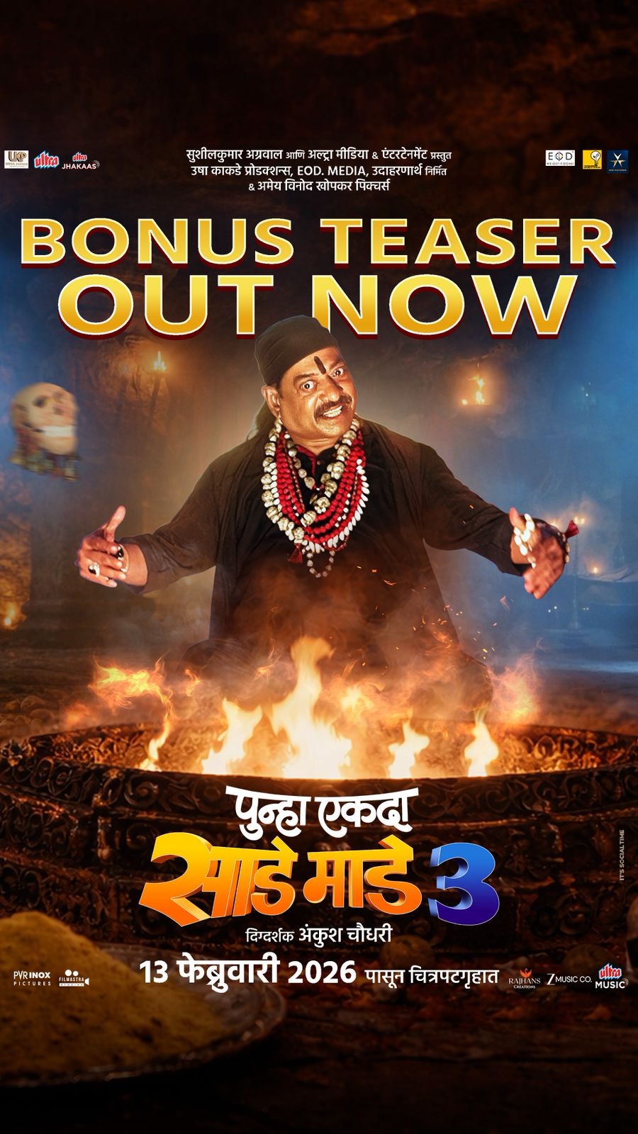 छत्रपती संभाजीनगर – प्रेक्षकांना खळखळून हसवण्यासाठी सज्ज असलेल्या ‘पुन्हा एकदा साडे माडे तीन’मधील कुरळे ब्रदर्सच्या गोंधळात आणखी एक धमाकेदार आकर्षण जोडले गेले आहे. लोकप्रिय अभिनेते संजय नार्वेकर या चित्रपटात बाबा खत्री या तांत्रिकाच्या हटके आणि गंमतीदार भूमिकेत दिसणार आहेत. त्यांच्या आगळ्यावेगळ्या लूकमुळे आणि भन्नाट टायमिंगमुळे चित्रपटातील विनोदाची रंगत आणखीनच वाढणार आहे. नुकत्याच प्रदर्शित झालेल्या या बोनस टिझरमुळे या चित्रपटाची उत्सुकता अधिकच वाढली आहे. मराठी सिनेसृष्टीत प्रमोशन दरम्यान अशा प्रकारे बोनस टिझर येणे हे पहिल्यांदाच पाहायला मिळत आहे.