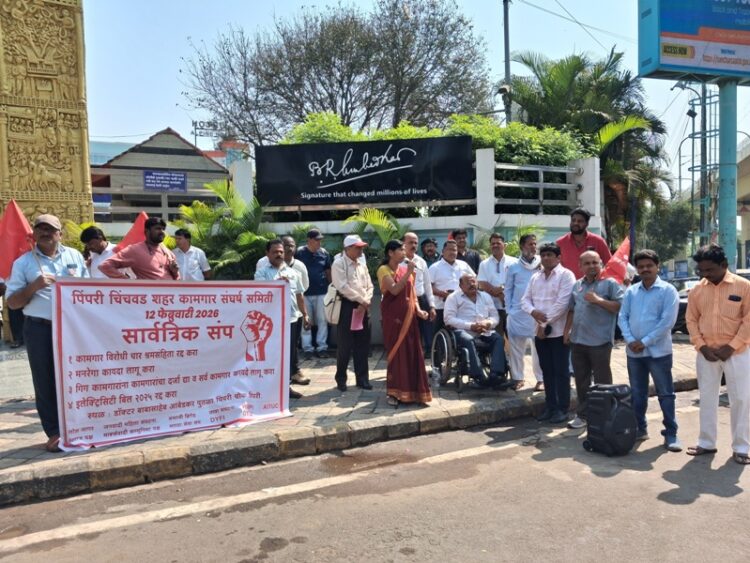 पिंपरी ता.१२ केंद्र सरकारने लागू केलेल्या चार नवीन श्रमसंहितांच्या विरोधात आणि जुने कामगार कायदे पुन्हा लागू करण्याच्या मागणीसाठी आज,१२ फेब्रुवारी २०२६ रोजी पिंपरी-चिंचवड शहर कामगार संघर्ष समितीच्या वतीने डॉ.बाबासाहेब आंबेडकर पुतळा,पिंपरी चौक,पिंपरी येथे भव्य निदर्शने करण्यात आले.