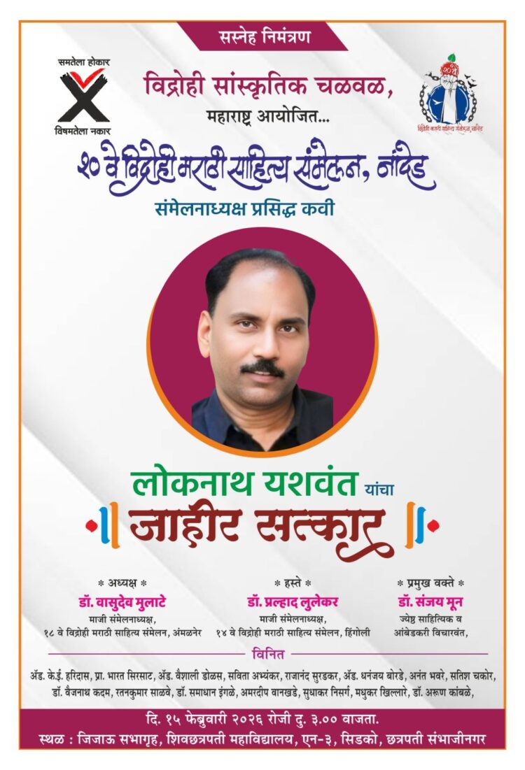छ.संभाजीनगर –विद्रोही सांस्कृतिक चळवळीच्या वतीने नांदेड येथे आयोजित २० व्या विद्रोही मराठी साहित्य संमेलनाच्या अध्यक्षपदी ज्येष्ठ कवी,लेखक, अनुवादक लोकनाथ यशवंत(नागपूर) यांची निवड झाल्याबद्दल दि.15 फेब्रुवारी 2026 रोजी दुपारी 3 वाजता राजमाता जिजाऊ सभागृह शिवछत्रपती महाविद्यालय एन.3 सिडको छत्रपती संभाजीनगर