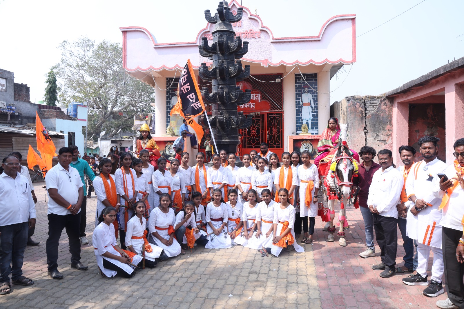 यावेळी कुमारी पुष्पा शालिक नागपुरे यांनी छत्रपती शिवाजी महाराजांची वेशभूषा साकारत आकर्षण ठरल्या, तर माँ जिजाऊ मातेच्या भूमिकेत कुमारी मानसी भगवान पंडित यांनी प्रभावी सादरीकरण केले. दोघींची वाजतगाजत मिरवणूक काढण्यात आली.